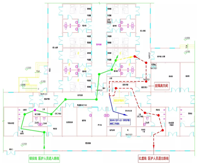 火神山醫院醫療設施按傳染病醫療流程進(jìn)行布局,且根據新型冠狀病毒感染的肺炎傳染病治療流程進(jìn)一步細化功能分區?;痉謪^為清潔區、限制區(半清潔區)、隔離區(半污染區和污染區),相鄰區域之間設置相應的衛生通過(guò)或緩沖間。醫護人員進(jìn)入及退出流線(xiàn)如圖3所示。
