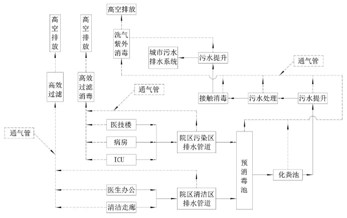 室外生活排水與雨水排水系統采用分流制,污染區的污廢水與清潔區污廢水分流排放,如病房、醫技和ICU等與辦公區、清潔走廊等衛生器具和裝置的污廢水與排水通氣系統均獨立設置,且污廢水各自獨立排放至預消毒池。為此,首先需要根據醫療設施建筑功能分區、醫療流程布局對清潔區與污染區進(jìn)行清楚地劃分,限制區污廢水可排入清潔區排水系統。