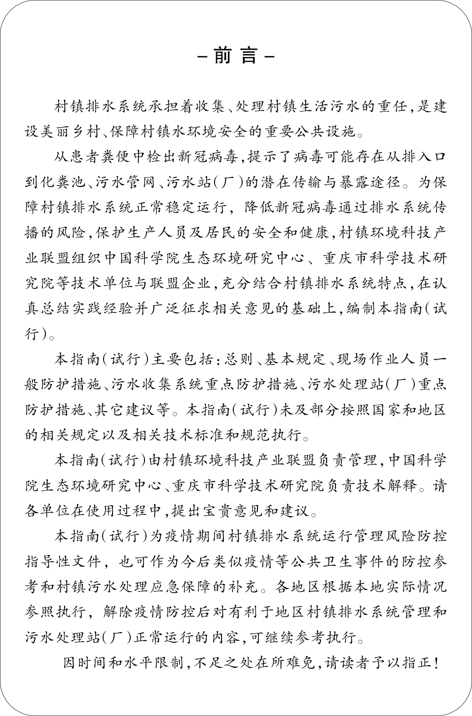 為了更好地指導村鎮污水處理領(lǐng)域的各參與主體科學(xué)管理、有效防控,保障村鎮排水系統正常穩定運行,降低疫情期間病毒通過(guò)排水系統傳播風(fēng)險,保障生產(chǎn)人員及居民的安全和健康,由中國科學(xué)院生態(tài)環(huán)境研究中心、村鎮環(huán)境科技產(chǎn)業(yè)聯(lián)盟、重慶市科學(xué)技術(shù)研究院主編,銀江環(huán)保應邀參編的《疫情期間村鎮排水系統運行管理風(fēng)險防控工作指南》(試行)(以下簡(jiǎn)稱(chēng)“《指南》”)于3月23日正式發(fā)布。